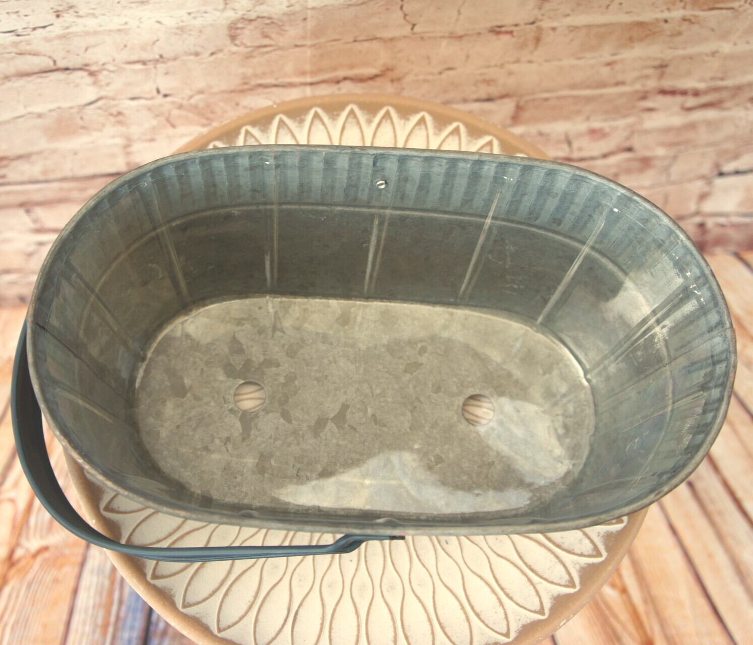 ブリキ素材の鉢で取ってが付いています。ツートンでネイビーブルーカラーです。